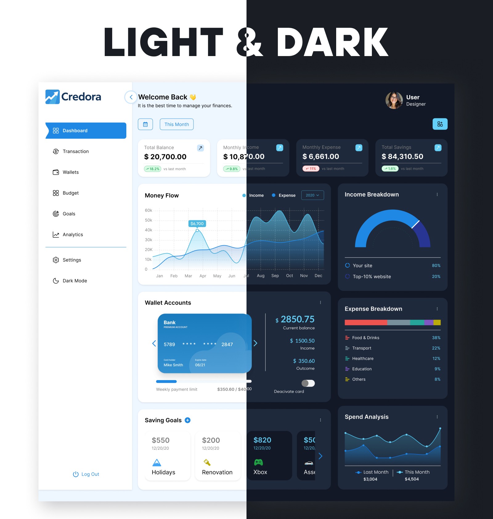 Dashboard — A financial control center prioritizing balance, trends, and goal visibility through modular, hierarchy-driven layouts.